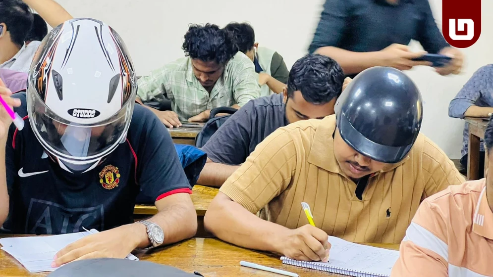 ক্যাম্পাসে হেলমেট পরে ক্লাসে অংশ নেওয়ার এই ঘটনা এখন শিক্ষার্থীদের নিরাপত্তা প্রশ্নকে নতুনভাবে সামনে নিয়ে এসেছে।