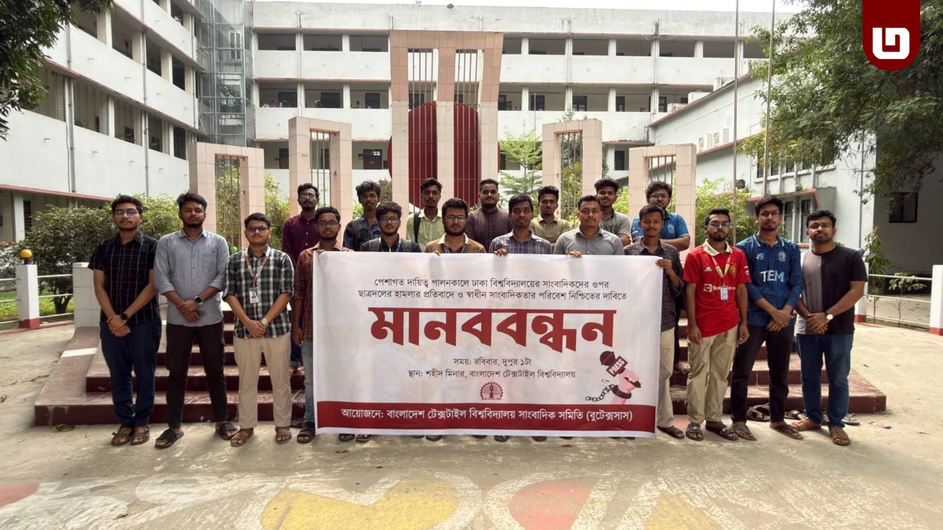 পেশাগত দায়িত্ব পালনকালে ঢাকা বিশ্ববিদ্যালয়ের (ঢাবি) সাংবাদিকদের ওপর ছাত্রদল নেতাকর্মীদের হামলার প্রতিবাদে এবং স্বাধীন সাংবাদিকতার পরিবেশ নিশ্চিতের দাবিতে মানববন্ধন করেছে বাংলাদেশ টেক্সটাইল বিশ্ববিদ্যালয় সাংবাদিক সমিতি (বুটেক্সসাস)।