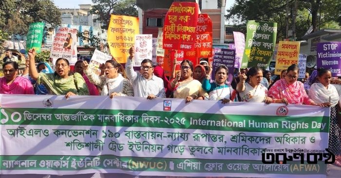 আজ ১০ ডিসেম্বর, বুধবার ২০২৫ ইং, সকাল: ১১:০০টায় জাতীয় প্রেসক্লাবের সামনে আন্তর্জাতিক মানবাধিকার দিবস-২০২৫ উপলক্ষে ন্যাশনাল ওয়ার্কার্স ইউনিটি সেন্টার ও এশিয়া ফ্লোর ওয়েজ অ্যালায়েন্স এর যৌথ উদ্যোগে আইএলও কনভেনশন ১৯০ বাস্তবায়ন-ন্যায্য রূপান্তর, শ্রমিকদের অধিকার ও শক্তিশালী ট্রেড ইউনিয়ন গড়ে তুলবে মানবাধিকার শীর্ষক শ্রমিক সমাবেশ ও র্যালী।