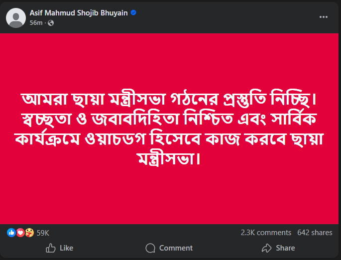 পোস্টে তিনি বলেন, ‘আমরা ছায়া মন্ত্রিসভা গঠনের প্রস্তুতি নিচ্ছি। স্বচ্ছতা ও জবাবদিহিতা নিশ্চিত এবং সার্বিক কার্যক্রমে ওয়াচডগ হিসেবে কাজ করবে ছায়া মন্ত্রিসভা।’