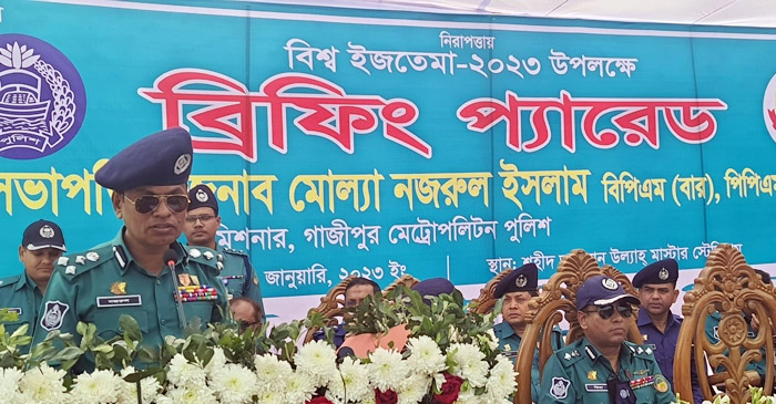 গাজীপুর মহানগর পুলিশের (জিএমপি) কমিশনার মোল্যা নজরুল ইসলাম পুলিশ সদস্যদের উদ্দেশে বলেছেন, বিশ্ব ইজতেমার নিরাপত্তায় কোনো রকম অবহেলা পাওয়া গেলে চাকরি থাকবে না। বৃহস্পতিবার (১২ জানুয়ারি) দুপুরে টঙ্গীর শহীদ আহসান উল্লাহ মাস্টার স্টেডিয়ামে ইজতেমার প্রস্তুতি উপলক্ষে আয়োজিত ব্রিফিং প্যারেডে এ হুঁশিয়ারি দেন তিনি। প্যারেডে প্রায় সাড়ে পাঁচ হাজার পুলিশ সদস্য উপস্থিত ছিলেন।