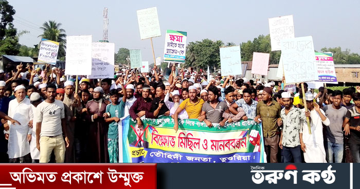 ফ্রান্সে মহানবী (সা.) কে অবমাননা করে ব্যাঙ্গাত্মক কার্টুন প্রদর্শনের প্রতিবাদে কুমিল্লা-নোয়াখালী আঞ্চলিক মহাসড়কের তুগুরিয়া এলাকায় বিক্ষোভ মিছিল ও প্রতিবাদ সমাবেশ অনুষ্ঠিত হয়েছে। শুক্রবার বাদ জুমা লাকসাম, মনোহরগঞ্জ ও নাঙ্গলকোট উপজেলার সাতেস্বর, ছোট তুগুরিয়া, বড় তুগুরিয়া, লুধুয়া, ও নোয়াপাড়াসহ ৭টি গ্রামের শত শত মুসল্লি ও ওলামায়ে কেরামের অংশগ্রহণে বিক্ষোভ মিছিলটি কুমিল্লা-নোয়াখালী আঞ্চলিক মহাসড়ক প্রদক্ষিণ করে। পরে তুগুরিয়া বাজারে বিক্ষোভ সমাবেশে বক্তব্য রাখেন, তুগুরিয়া বাজার জামে মসজিদের খতিব মাওলানা আবুল বাশার, ছোট তুগুরিয়া জামে মসজিদের খতিব মাওলানা সালমান ইবনে শামছুল হুদা, মুফতি মিজানুর রহমান, ইউপি মেম্বার মোঃ জসিম উদ্দিন, সাবেক মেম্বার এনায়েত উল্লাহ, মাওলানা আবুল হোসেন, মোবারক হোসেন প্রমুখ।