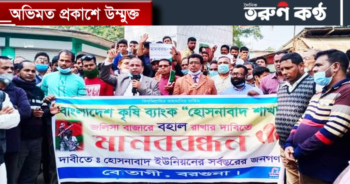 বরগুনার বেতাগী উপজেলার হোসনাবাদ ইউনিয়ন শাখার কৃষি ব্যাংক বহাল রাখার দাবীতে মানববন্ধন ও বিক্ষোভ মিছিল করেছে স্থানীয় বাসিন্দা ও গ্রাহকরা। আজ বৃহস্পতিবার (৩ ডিসেম্বর ২০২০খ্রি. তারিখ) সকাল ১১টায় জলিশা বাজারের রাসেল স্কয়ারে এ কর্মসূচি পালন করা হয়।