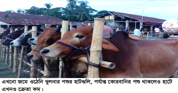 জানা যায়, গতকাল খুলনায় ঐতিহ্যবাহী জোড়াগেট পশুর হাট উদ্বোধন করা হলেও বাজারে তেমন কোন গরু নেই। এছাড়া খুলনার ডুমুরিয়া, খর্নিয়া, আঠারমাইল এলাকায় গরুর বাজার জমেনি।