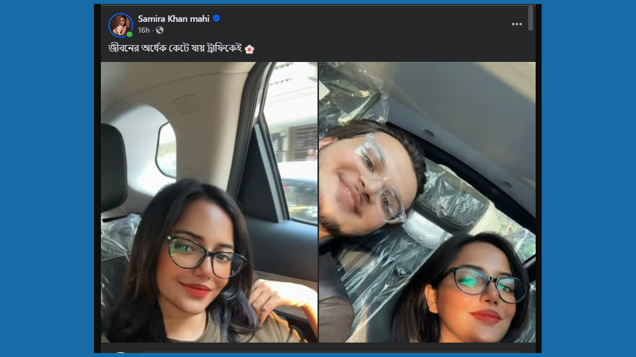 ছোট পর্দার জনপ্রিয় অভিনেত্রী সামিরা খান মাহি আবারও ভক্তদের মাঝে আলোচনায়। সম্প্রতি রাজধানীর তীব্র যানজটের মধ্যে প্রেমিক সাদাত শাফি নাবিলের সঙ্গে তোলা ছবি সামাজিক যোগাযোগমাধ্যমে শেয়ার করেছেন তিনি। ছবির ক্যাপশনে লিখেছেন, “জীবনের অর্ধেক কেটে যায় ট্রাফিকেই।”