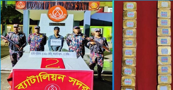 এ সময় নাফ নদীতে মৎস্য আহরণ শেষে জাল হাতে কেওড়া বাগানের ভেতর দিয়ে এক যুবককে বেড়ীবাঁধ উঠতে দেখেন তারা। টহল দল তাকে আটক করে। পরে তাকে তল্লাশি করে তার কোমরে অভিনব পদ্ধতিতে ফিটিং অবস্থায় জাল ও টেপ দিয়ে মোড়ানো ২টি স্বর্ণের বারের বেল্ট এবং ৫ কেজি কারেন্ট জাল জব্দ করা হয়। পরবর্তীতে বেল্টটি খুলে ২০টি স্বর্ণের বার মেলে। উদ্ধারকৃত স্বর্ণের বারের ওজন ৩ কেজি ৩২০ গ্রাম।