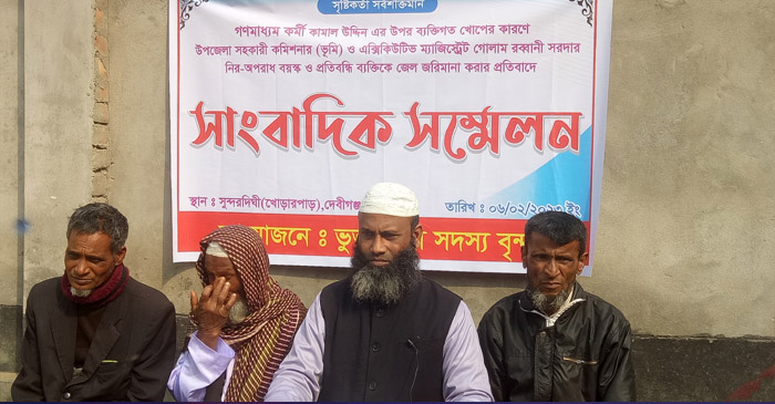 পঞ্চগড়ের দেবীগঞ্জ উপজেলায় ব্যক্তিগত ক্ষোভের কারণে ভ্রাম্যমান আদালত পরিচালনা করে নিরপরাধ ব্যক্তিকে সাজা দেওয়ায়, সহকারী কমিশনার ভূমি ও এক্সিকিউটিভ ম্যাজিস্ট্রেট গোলাম রব্বানি সরদার এর বিরুদ্ধে সংবাদ সম্মেলন করেছে ভুক্তভোগীর পরিবার। এর আগে গত ১৬ই জানুয়ারি ২০২৩ উপজেলার সুন্দরদ্বিঘী ইউনিয়নে ইট প্রস্তুত ও ভাটা স্থাপন নিয়ন্ত্রণ আইন ২০১৩ এর (৫)১ লঙ্ঘন আইনে ভ্রাম্যমান আদালত পরিচালনা করেন সহকারী কমিশনার ভূমি ও এক্সিকিউটিভ ম্যাজিস্ট্রেট গোলাম রব্বানি সরদার। সংবাদ সম্মেলনে লিখিত বক্তব্য উপস্থাপন করেন ভুক্তভোগী মোঃ কামাল উদ্দিন। তিনি বলেন, আমি মোঃ কামাল উদ্দীন ও মোঃ আব্দুর রাজ্জাক গত ২৩/১০/১৯৮১ ইং তারিখের দলিল নং- ৫৭৪৪ এর মূলে ১৬ শতক জমি ক্রয় করি। যার দাগ নং- ২৪৫০। ধরন ডাঙ্গা। সরকারি রাজস্ব কর পরিশোধের মধ্য দিয়ে ক্রয়ের পর থেকে দীর্ঘদিন - ধরে ভোগদখল করে আসিতেছি। এমতাবস্থায় জরুরি টাকার প্রয়োজনে উক্ত জমিটি স্থানীয় বাসিন্দা মোঃ সাহেব আলী, পিতা তমিজ উদ্দিন গ্রাম সুন্দরদিঘী ডাকঘর সুন্দরদিঘী থানা দেবীগঞ্জ জেলা পঞ্চগড় এর কছে ৪৫ হাজার টাকার বিনিময়ে বর্গা প্রদান করি। জমিটি তুলনামূলক ভাবে বেশি উঁচু ও এক ফসলি হওয়ায় বর্গাচাষী মোঃ সাহেব আলী আমাকে ও আমার ভাই মোঃ আব্দুর রাজ্জাক'কে একাধিকবার কিছু মাটি কর্তন করে নিচু করে দুই ফসলি জমিতে রূপান্তরিত করার পরামর্শ দেন। এমতাবস্থায় আমার জমিটির পাশের জমিতে পুকুর খননের জন্য ভেকু গাড়ি আসলে পুকুর খননের পূর্বেই আমার জমিটি দুই ফসলী রূপান্তরিত করার জন্য একটু খনন করে দেয়। এ সময় দেবীগঞ্জ সহকারী কমিশনার ভূমি ও এক্সিকিউটিভ ম্যাজিস্ট্রেট গোলাম রব্বানি সরদার ঐ স্থানে উপস্থিত হয়ে ইট প্রস্তুত ও ভাটা স্থাপন নিয়ন্ত্রণ আইনে ভ্রাম্যমান আদালত পরিচালনা করেন। ঐ সময় তিনি লোক মারফতে আমার বাবাকে ঘটনাস্থলে নিয়ে যান। এবং আমার প্রতিবন্ধী চাচা মোঃ বাবুল হোসেন ঘটনাস্থলে আসলে আমার বাবা মোঃ চাঁনমিয়া(৮৫)কে দুই লক্ষ টাকা জরিমানা ও প্রতিবন্ধী ) চাচা মোঃ বাবুল হোসেন (৫৫) কে ১মাসের বিনাশ্রম কারাদণ্ড প্রদান করেন। সাথে আরো দুইজনকে কারাদণ্ড প্রদান করেন। পরবর্তীতে আমাকে কল দিয়ে বলেন, দ্রুত ঘটনাস্থলে আসার জন্য। না আসলে জমিটি খাস খতিয়ানে দিবেন এবং আমার বাবাকে ছয় মাসের কারাদণ্ডে দণ্ডিত করা হবে। পরে আমার অসুস্থ বাবার কথা চিন্তা করে দুইলক্ষ টাকা জোগাড় করে জমা দিয়ে আমার বাবাকে মুক্ত করি। আমার বাবা ও আমার চাচা প্রতিবন্ধী এর সাথে ঐ জমির কোন সম্পৃক্ততা নেই। আমার অজান্তেই বর্গাচাষী চাষাবাদের সুবিধার্থে ও দুই ফসলি জমিতে রূপান্তরিত করার জন্যে মাটি কর্তন করে নিচু করার কাজ করেছে। কোন ভাবেই জমি নষ্ট করা হয় নি। পরে বিষয়টি নিয
