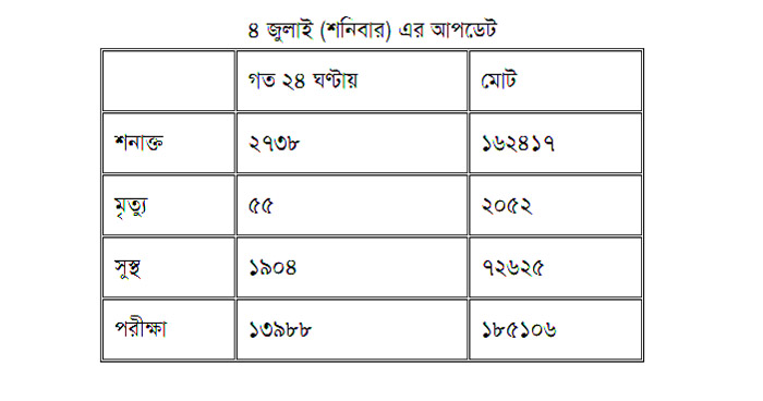 অতিরিক্ত মহা-পরিচালক জানান, গত ২৪ ঘণ্টায় ১৩ হাজার ৯৮৮ জনের নমুনা পরীক্ষা করা হয়েছে। এর মধ্যে সর্বোচ্চ ২ হাজার ৭৩৮ জনের দেহে কোভিড-১৯ সংক্রমণ পাওয়া গেছে। এ নিয়ে আক্রান্তের সংখ্যা ১ লাখ ৬২ হাজার ৪১৭ জনে ঠেকেছে। এর মধ্যে নতুন করে প্রাণ গেছে ৫৫ জনের। এতে করে এ পর্যন্ত ২ হাজার ৫২ জনের মৃত্যু হয়েছে ভাইরাসটিতে।