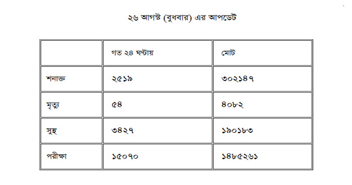 বুধবার (২৬ আগস্ট) বিকেলে করোনাভাইরাস নিয়ে স্বাস্থ্য অধিদফতরের প্রেস বিজ্ঞপ্তিতে এ তথ্য জানানো হয়।
