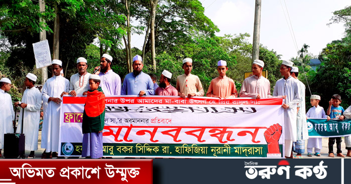 ফ্রান্সে রাসূল (সা.)-কে কটাক্ষ করে ব্যঙ্গচিত্র প্রদর্শনী ও অবমাননার প্রতিবাদে দক্ষিণ সুনামগঞ্জ উপজেলার ঐতিহ্যবাহী দ্বীনি শিক্ষা প্রতিষ্ঠান হযরত আবু বক্কর সিদ্দিক (রা.) মাদরাসার উদ্যোগে মানববন্ধন করা হয়েছে।