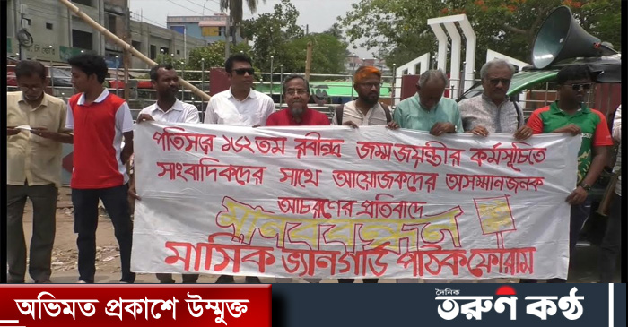 নওগাঁর পতিসরে রবীন্দ্রজয়ন্তীর উদ্বোধনী অনুষ্ঠানে সাংবাদিকদের অসন্মানিত করার প্রতিবাদস্বরুপ মানববন্ধন কর্মসূচী পালন করা হয়েছে। আজ শুক্রবার বেলা সাড়ে ১১টায় মুক্তিরমোড় কেন্দ্রী শহীদমিনারের সামনে প্রধান সড়কে ঘন্টাব্যপী এই মানববন্ধন কর্মসূচীর আয়োজন করে বাসদের প্রকাশনা ভ্যানগার্ড পাঠক ফোরাম।