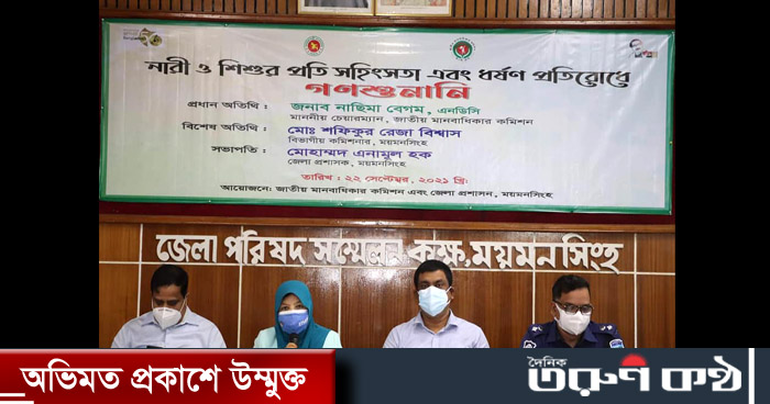 ময়মনসিংহ জেলা পরিষদ সম্মেলন কক্ষে ২২ সেপ্টেম্বর, বুধবার ২০২১ খ্রিঃ তারিখ জাতীয় মানবাধিকার কমিশনের আয়োজনে এবং জেলা প্রশাসন ময়মনসিংহ এর সহযোগিতায় নারী ও শিশুর প্রতি সহিংসতা এবং ধর্ষণ প্রতিরোধে গণশুনানি অনুষ্ঠিত হয়েছে।জনাব মোহাম্মদ এনামুল হক, জেলা প্রশাসক, ময়মনসিংহ এর সভাপতিত্বে উক্ত গণশুনানি অনুষ্ঠানে প্রধান অতিথি হিসেবে উপস্থিত ছিলেন জনাব নাছিমা বেগম, এনডিসি, মাননীয় চেয়ারম্যান,জাতীয় মানবাধিকার কমিশন। বিশেষ অতিথি হিসেবে উপস্থিত ছিলেন জনাব মোঃ শফিকুর রেজা বিশ্বাস, বিভাগীয় কমিশনার, ময়মনসিংহ।