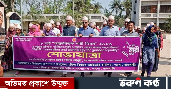 বিভিন্ন কর্মসূচীর মধ্য দিয়ে পাংশা উপজেলা প্রশাসন ও উপজেলা মহিলা বিষয়ক কর্মকর্তার কার্যালয়ের আয়োজনে ৮ মার্চ “আর্ন্তজাতিক নারী দিবস” পালিত হয়েছে। এ উপলক্ষে র‌্যালী আলোচনা সভা ও সাংস্কৃতিক অনুষ্ঠান অনুষ্ঠিত হয়। বুধবার (৮ মার্চ) সকাল সাড়ে ১০ টায় উপজেলা পরিষদের সামনে থেকে বর্ণাঢ্য র‌্যালী বের করা হয়। র‌্যালী শেষে উপজেলা পরিষদের সম্মেলন কক্ষে আলোচনা সভা অনুষ্ঠিত হয়েছে। “ডিজিটাল প্রযুক্তি ও উদ্ভাবন, জেন্ডার বৈষম্য করবে নিরসন” প্রতিপাদ্যকে সামনে রেখে আলোচনা সভায় পাংশা উপজেলা নির্বাহী অফিসার মোহাম্মদ জাফর সাদিক চৌধুরী’র সভাপতিত্বে প্রধান অতিথি হিসাবে বক্তব্য রাখেন পাংশা উপজেলা পরিষদের চেয়ারম্যান মোঃ ফরিদ হাসান ওদুদ। অনুষ্ঠানে বিশেষ অতিথি হিসাবে বক্তব্য রাখেন, উপজেলা সহকারী কমিশনার (ভূমি) মোহাম্মাদ মাসুদুর রহমান রুবেল, উপজেলা মহিলা ভাইস চেয়ারম্যান মোছাঃ রোকেয়া খাতুন, উপজেলা প্রকৌশলী মোঃ জাকির হাসান, ভেটেনারী সার্জন ডা. মোঃ মোত্তালিব আলী, সাংবাদিক মোক্তার হোসেন, পাংশা স্পোর্টিং ক্লাবের সভাপতি সাংবাদিক মাসুদ রেজা শিশির প্রমুখ। অনুষ্ঠানে স্বাগত বক্তব্য রাখেন উপজেলা মহিলা বিষয়ক কর্মকর্তা তাহমিদা খানম। অনুষ্ঠান সঞ্চালনা করেন পাংশা উপজেলা যুব উন্নয়ন অফিসার শ্যালল কুমার বিশ্বাস। এ সময় উপজেলা সমাজ সেবা অফিসার মোঃ রবিউল ইসলাম, উপজেলা শিল্পকলা একাডেমির সাধারণ সম্পাদক মোঃ রিয়াজুল ইসলাম জাহাঙ্গীরসহ বিভিন্ন নারী উন্নয়ন সমিতির সভানেত্রীগন উপস্থিত ছিলেন। পরে সাংস্কৃতিক অনুষ্ঠান উপভোগ করেন আমন্ত্রিত অতিথিগন।