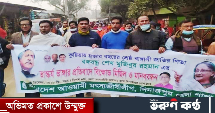 ৭ ডিসেম্বর সোমবার বিকেল বেলায় একটি বিক্ষোভ মিছিল শহরের বড় বন্দর, যোগেন বাবুর মাঠ এলাকাসহ শহরের প্রধান প্রধান সড়ক প্রদক্ষিণ করে ,পরে এক সংক্ষিপ্ত সমাবেশে বক্তারা ভাস্কর্য ভাঙচুরকারীরা দেশের বিরুদ্ধে ষড়যন্ত্র করছে উল্লেখ করে আওয়ামী মৎস্য লীগকে ঐক্যের আহ্বান জানান, জেলা আওয়ামী মৎস্য লীগের সদস্য সচিব ইসমাইল হোসেন বলেন বলেন, কুষ্টিয়ায় বঙ্গবন্ধুর নির্মাণাধীন ভাস্কর্য ভাঙচুরের, এই ন্যাক্কার জনক ঘটনায় জড়িত ও হুমকি দাতাদের অবিলম্বে আইনের আওতায় আনার দাবি জানান বিক্ষোভ মিছিল ও মানববন্ধন কর্মসূচিতে অংশগ্রহণ করেন দিনাজপুর জেলার ১৩ উপজেলার আওয়ামী মৎস্য লীগ লীগের অঙ্গ সংগঠনের সকল নেতাকর্মী ও নেতৃবৃন্দরা ।