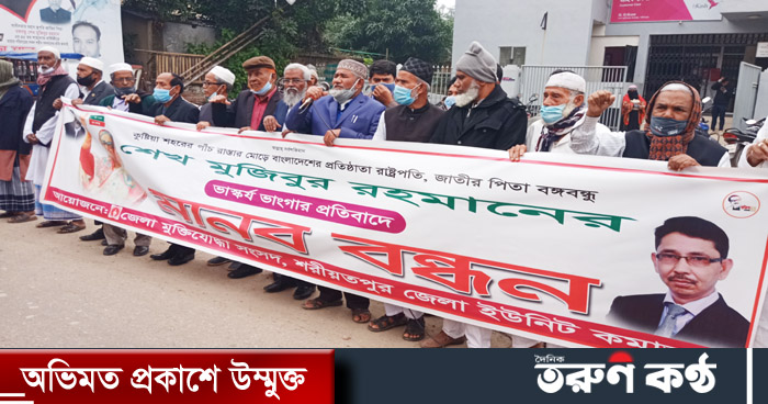 শরীয়তপুরে জাতির পিতা বঙ্গবন্ধ শেখ মুজিবুর রহমানের কুষ্টিয়ায় ভাস্কর্য ভাঙার প্রতিবাদে জামাত-শিবির মৌলবাদী গোষ্ঠীর বিরুদ্ধে মুক্তিযুদ্ধাদের মানববন্ধন।