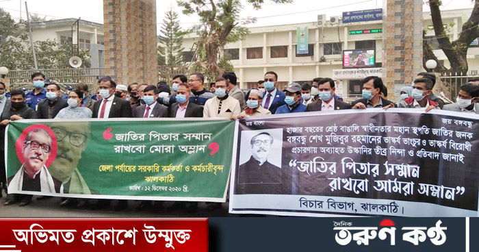 জাতির পিতা বঙ্গবন্ধু শেখ মুজিবুর রহমানের ভাস্কর্য ভাঙ্গার প্রতিবাদ করেছে ঝালকাঠি জেলা প্রশাসন ও বিচার বিভাগ। সনিবার সকাল ১০ টায় এ উপলক্ষে বিচার বিভাগের জেলা ও দায়রা জজ মো. শহিদুল্লাহ এর নেতৃত্বে পৃথক ব্যানারে বিচারকবৃন্দ ও কর্মচারীরা জেলা প্রশাসকের কার্যালয়ের সামনে উপস্থিত হন। একই সাথে জেলা প্রশাসক মো. জোহর আলী ও পুলিশ সুপার ফাতিহা ইয়াসমিনের নেতৃত্বে পৃথক ভাবে প্রশাসনের সরকারি কর্মকর্তা কর্মচারীরা প্রতিবাদ মানববন্ধনে অংশ নেন। সম্মিলিত এই বিশাল মানববন্ধনে বক্তব্য রাখেন জেলা ও দায়রা জজ মো. শহিদুল্লাহ, জেলা প্রশাসক মো. জোহর আলী ও পুলিশ সুপার ফাতিহা ইয়াসমিন। বক্তারা বলেন,  বঙ্গবন্ধু শেখ মুজিব মানেই আমাদের স্বাধীনতার চেতনা ও স্বাধীন বাংলাদেশ। তাই তার ভাস্কর্য ভাঙ্গা মানেই এ দেশের স্বাধীনতার উপর আঘাত করে অবদান অস্বিকার করা। তার নেতৃত্বেই এদেশের স্বাধীনতার সূর্য্য উদিত হয়ে ছিল। আমরা এর তীব্র প্রতিবাদ জানিয়ে ঘটনার সাথে জড়িতদের বিচার দাবি করছি। কর্মসূচি পরিচালনা করেন অতিরিক্ত জেলা প্রশাসক সার্বিক মো. আরিফুল ইসলাম।