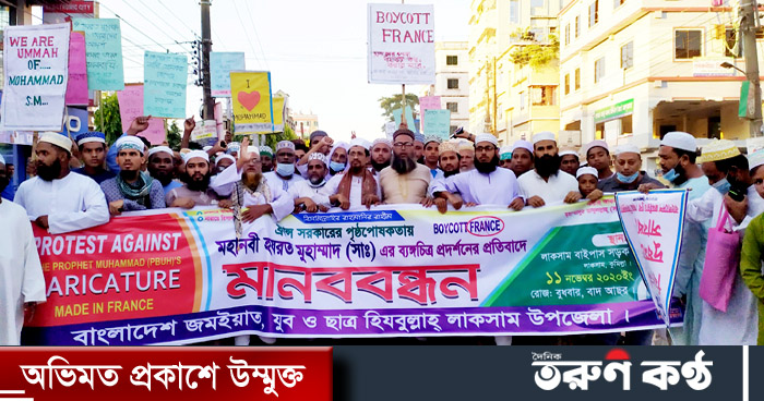 ফ্রান্সে মহানবী হযরত মুহাম্মাদ সাল্লাল্লাহু আলাইহি ওয়া সাল্লাসকে নিয়ে ব্যাঙ্গ কার্টুন প্রদর্শনের প্রতিবাদে কুমিল্লার লাকসামে মানবন্ধন, বিক্ষোভ মিছিল ও প্রতিবাদ সমাবেশ করেছে বাংলাদেশ জমইয়াতে হিযবুল্লাহ, যুব হিযবুল্লাহ ও ছাত্র হিযবুল্লাহর লাকসাম উপজেলা শাখা।