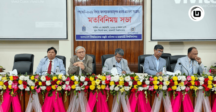 জাতীয় নির্বাচনকে সামনে রেখে গণতন্ত্র ও নাগরিক ভোটাধিকার বিষয়ে সচেতনতা বাড়ানোর লক্ষ্যে রাজশাহী বিশ্ববিদ্যালয় (রাবি) প্রশাসন ও বাংলাদেশ বিশ্ববিদ্যালয় মুন্জুরি কমিশনের উদ্যোগে 'গণেভোট-২০২৬ বিষয়ে জনসচেতনতামূলক প্রচার-প্রচারণা' শীর্ষক মতবিনিময় অনুষ্ঠিত হয়েছে।