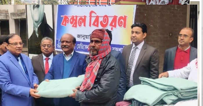 রাজশাহী মেডিকেল বিশ্ববিদ্যালয়ের (রামেবি) উদ্যোগে অসহায় ও দরিদ্রদের মাঝে কম্বল বিতরণ করা হয়েছে। বুধবার (৪ জানুয়ারি) সকাল ১১ টায় রামেবির অস্থায়ী কার্যালয়ে অসহায়  ও বয়স্কদের মাঝে এ কম্বল বিতরণ করা হয়। অনুষ্ঠানে প্রধান অতিথি হিসেবে উপস্থিত থেকে কম্বল বিতরণ করেন,রাজশাহী মেডিকেল বিশ্ববিদ্যালয়ের উপাচার্য অধ্যাপক ডা: এ.জেড. এম মোস্তাক হোসেন। কম্বল বিতরণকালে উপাচার্য বলেন,সমাজের অসহায় ও দরিদ্র মানুষের সেবা করা সবার দায়িত্ব।মাননীয় প্রধানমন্ত্রী শেখ হাসিনা দেশের সকল মানুষের উন্নয়নের জন্য নিরলস পরিশ্রম করে যাচ্ছেন।বিশেষ করে অসহায় ও দরিদ্র মানুষের জন্য নিবেদিত প্রান। তিনি আরো বলেন,সমাজের সকল স্তরের মানুষকে নিজ নিজ জায়গা থেকে সহায়তার হাত বাড়াতে হবে।এর ফলে যেমন অসহায় মানুষগুলোর উপকার হয়,তেমনি সৃষ্টিকর্তাও খুশি হোন। বিশেষ অতিথি হিসেবে উপস্থিত ছিলেন, রামেবির কোষাধ্যক্ষ প্রফেসর ড. রুস্তম আলী আহমেদ ও রামেবির ডেন্টাল অনুষদের ডিন অধ্যাপক ডা. মো: বুলবুল হাসান। এ সময় উপস্থিত ছিলেন,রামেবির রেজিস্ট্রার অধ্যাপক ডা. আনোয়ারুল কাদের,পরিচালক (প.উ.) ইঞ্জিনিয়ার মো: সিরাজুম মুনির,ডা. মো: জাকির হোসেন খোন্দকার,পরিচালক ( অ.হি.), পরীক্ষা নিয়ন্ত্রক অধ্যাপক ডা মো: আনোয়ার হাবিব,কলেজ পরিদর্শক অধ্যাপক ডা. মোহাম্মদ মোসাদ্দেক হোসেন,উপ-পরিচালক (প.উ.) এস.এম.ওবায়দুল ইসলাম,উপ-রেজিস্ট্রার ডা. মো: আমিন আহমেদ খান,উপাচার্য'র একান্ত সচবি (ভারপ্রাপ্ত) মো: ইসমাঈল হোসেনসহ রামেবির সকল কর্মকর্তা কর্মচারীবৃন্দ উপস্থিত ছিলেন। এরপরে ২০২৩ সালের ক্যালেন্ডারের মোড়ক উন্মোচন করেন উপাচার্য অধ্যাপক ডা.এ জেড. এম মোস্তাক হোসেন।