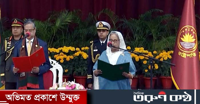 নতুন সরকারের প্রধানমন্ত্রী হিসেবে শপথ নিলেন শেখ হাসিনা। বৃহস্পতিবার (১১ জানুয়ারি) সন্ধ্যা ৭টা ৩ মিনিটে রাষ্ট্রপতি মোহাম্মদ সাহাবুদ্দিন বঙ্গভবনের দরবার হলে তাকে শপথ বাক্য পাঠ করান। সংবিধানের ৫৬ অনুচ্ছেদের ৩ ধারা অনুযায়ী প্রধানমন্ত্রী এ শপথ নেন।