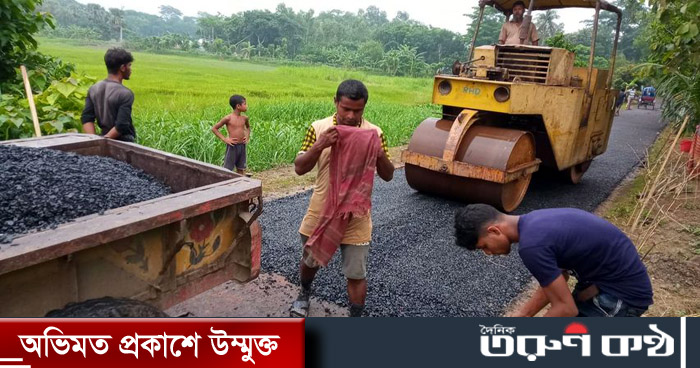 শরীয়তপুরে বৃষ্টির মধ্যে চলছে রাস্তার পিচ ঢালাইয়ের কাজ