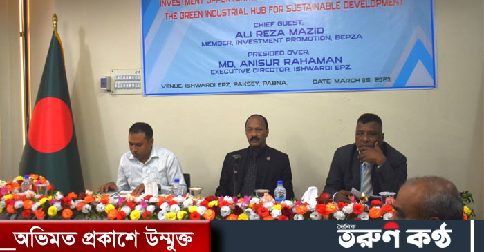 রোববার পাবনার ঈশ্বরদী ইপিজেডস্থ কনফারেন্স রুমে ‘Investment Opportunities in the EPZs and EZ under BEPZA The green Industrial Hub for Sustainable Development’ শীর্ষক সেমিনারে বক্তরা এসব মত দেন। এতে মূল প্রবন্ধ উপস্থাপন করেন সরকারের অতিরিক্ত সচিব ও বাংলাদেশ রপ্তানি প্রক্রিয়াকরণ এলাকা কর্তৃপক্ষের (বেপজা) সদস্য (বিনিয়োগ ও উন্নয়ন) আলী রেজা মজিদ। ঈশ্বরদী ইপিজেডের নির্বাহী পরিচালক মো. আনিসুর রহমানের সভাপতিত্বে উপজেলা নির্বাহী কর্মকর্তা (ইউএনও) পি এম ইমরুল কায়েস, পাবনা চেম্বার অব কমার্সের প্রতিনিধি, সরকারের বিভিন্ন দপ্তরের প্রতিনিধি ও ইপিজেডস্থ দেশি-বিদেশি বিনিয়োগকারীরা উপস্থিত ছিলেন।