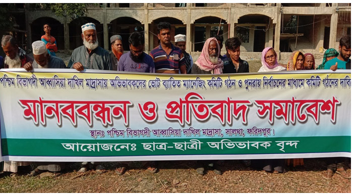 ফ‌রিদপু‌রের সালথা উপ‌জেলায় প‌শ্চিম বিভাগদী আব্বা‌সিয়া দা‌খিল মাদ্রাসায় অভিভাবক‌দের ভোট ব‌্যা‌তিত  ম‌্যা‌নি‌জিং ক‌মি‌টি গঠন এবং পুনরায় ‌নির্বাচ‌নের মাধ‌্যমে ক‌মি‌টি গঠ‌নের মানববন্ধন ও প্রতিবাদ সমা‌বেশ ক‌রে‌ছে অ‌ভিভাবক ও ছাত্র-ছাত্রীরা।