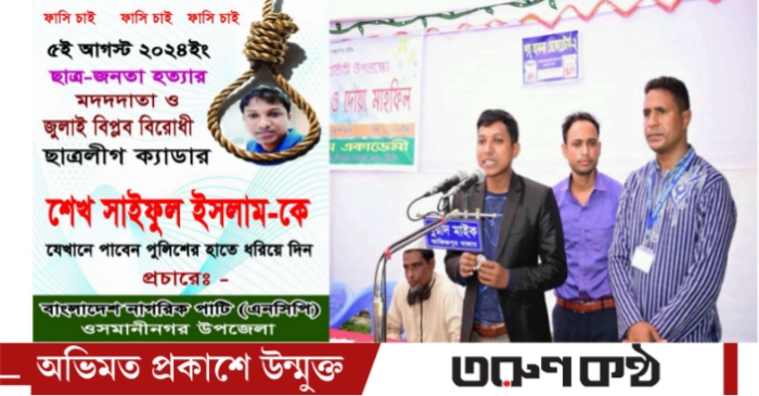 সিলেটের ওসমানী নগর উপজেলায় ৫ আগস্টের হত্যাকাণ্ডে জড়িত থাকার অভিযোগে ছাত্রলীগের ক্যাডার শেখ সাইফুল ইসলাম কে গ্রেফতারের দাবিতে জাতীয় নাগরিক পার্টি (এনসিপি) ব্যাপক ফেস্টুন ও ব্যানার প্রচার শুরু করেছে। উপজেলার বিভিন্ন প্রধান সড়ক, বাজার এলাকা এবং গুরুত্বপূর্ণ মোড়গুলোতে এই ফেস্টুনগুলো টানানো হয়েছে।